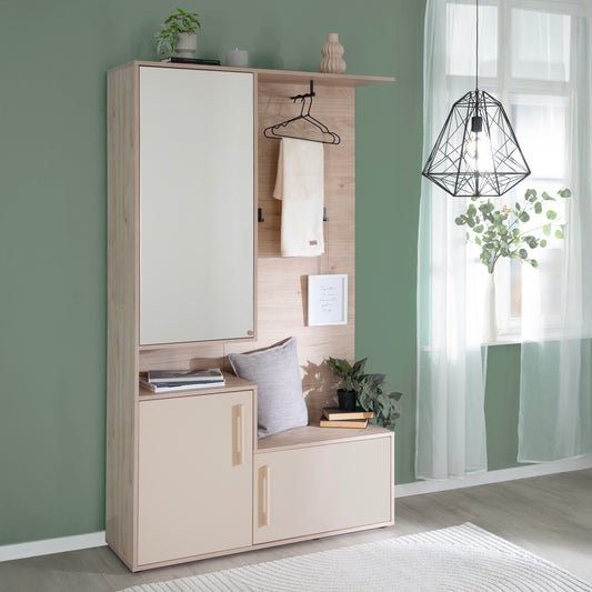 Kompaktgarderobe "Entry" mit Spiegeltür, Sitzbank, Stauraum und Kleiderhaken, Cashmere Weiß und Kastanien Dekor