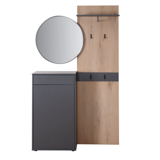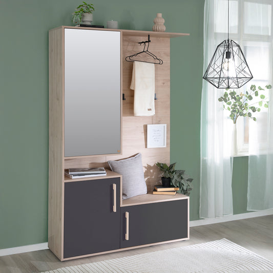 Kompaktgarderobe "Entry" mit Spiegeltür, Sitzbank, Stauraum und Kleiderhaken, Basalt Grau mit Artisan Eiche