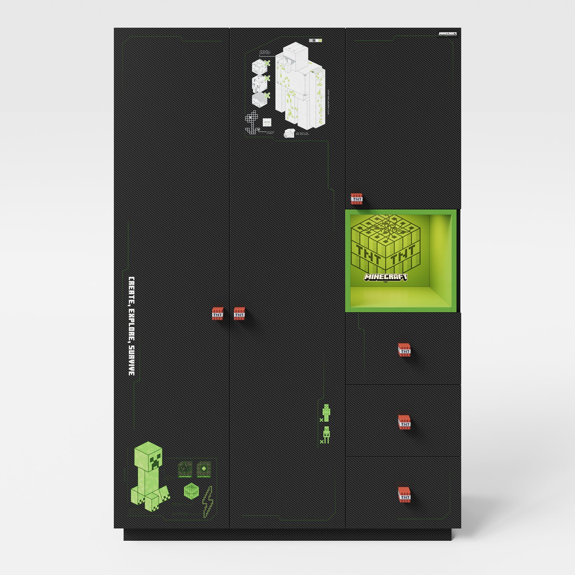 Entdecken Sie den ultimativen Kleiderschrank aus der exklusiven Minecraft Möbelkollektion – ein Must-Have für jeden Minecraft-Fan! Dieser stilvolle Kleiderschrank kombiniert Funktionalität und Design auf einzigartige Weise und bietet mit seinen 3 Türen, 3 Schubladen, 1 Kleiderstange und mehreren Einlegeböden enorm viel Stauraum für all Ihre Kleidungsstücke und Accessoires. Besonders hervorzuheben ist das offene, beleuchtete Fach, das sich perfekt für die Präsentation Ihrer Lieblingsstücke eignet und jedem Raum eine besondere Atmosphäre verleiht. Die kleinen TNT Würfel als Türgriffe setzen ein verspieltes Highlight und erinnern an die ikonischen Elemente aus dem beliebten Spiel. Der Kleiderschrank besticht durch seine elegante, dunkle Carbon-Optik, die sich nahtlos in jedes moderne Wohnambiente einfügt und gleichzeitig ein Hauch von Abenteuer und Fantasie vermittelt. Robust, geräumig und stilvoll – dieser Schrank ist nicht nur ein funktionales Möbelstück, sondern auch ein echter Blickfang. Erleben Sie die perfekte Kombination aus Minecraft-Charme und erstklassigem Design. Sorgen Sie für Ordnung und Stil in Ihrem Zuhause mit dem Kleiderschrank aus der Minecraft Möbelkollektion.